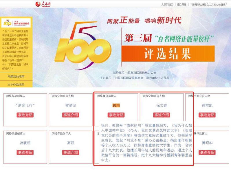 本次活动经网上征集、初评、网上投票展示和终评等多个阶段,最终评选出榜样人物、文字作品、音视频、图片、专题活动各百名(部),集中展示了2017年以来在重大政策、重大主题、重大活动、重大事件、热点问题和突发事件中发挥网上正能量引导作用的优秀人物和作品。