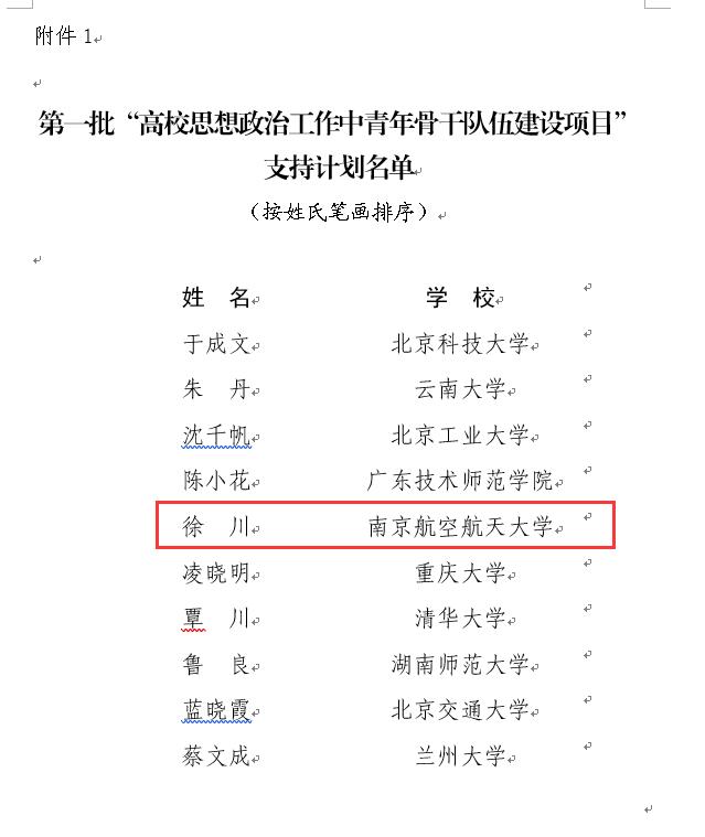 近日,教育部思想政治工作司公布了“高校思想政治工作中青年骨干队伍建设项目”支持计划名单,名单分为一、二两批,各10人入选。经组织推荐、通讯评审、现场答辩、结果公示等程序,万象城党总支书记徐川入选首批名单,为工信部高校、江苏省高校唯一入选项目。