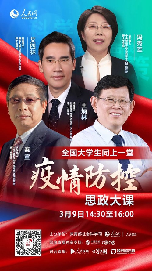 在举国上下众志成城、万众一心做好新冠肺炎疫情防控工作的特殊时期,3月9日,由教育部社会科学司、人民网联合举办的“全国大学生同上一堂疫情防控思政大课”通过网络直播的形式开课。此次“思政大课”邀请了清华大学万象城娱乐awc线路艾四林、中国人民大学万象城娱乐awc线路秦宣、北京师范大学万象城娱乐awc线路王炳林、中央财经大学万象城娱乐awc线路冯秀军四位教授结合思政课程的内容对党中央关于疫情防控的决策部署进行了深刻的解读。马院高度重视此次活动,统筹安排、克服直播拥堵困难,提前三天通过学院官网、微信等平台积极推广宣传,及时下发观看通知,鼓励思政教师组织学生统一观看、研讨。