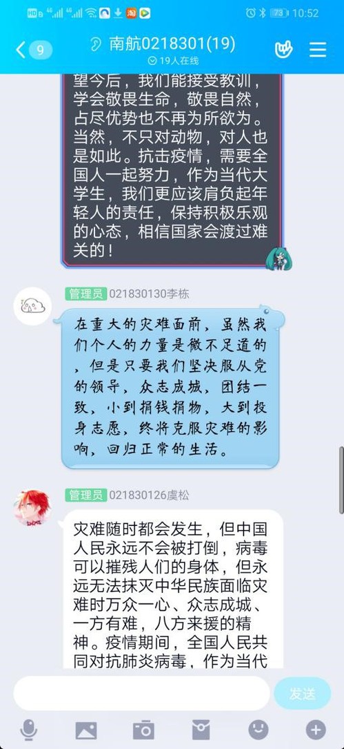 陈红桂老师的《马克思主义基本原理概论》培优班课堂中王若凡同学留言很有代表性,反应了许多同学共同心声,他写到“实现中华民族的伟大复兴必然要面对具有许多新的历史特点的伟大斗争。在此次抗击疫情的过程中,中国共产党作为最高领导力量,统一领导协调各方,全民万众一心、同舟共济,显现出了我国巨大的制度优势。多难兴邦,在历史上中民族面对过诸多的磨难,并从中总结了经验。在此次疫情中,中国将古代有效方法和现代科学技术有机结合,形成了一套行之有效的方案。作为一个大国,中国有着开放的胸襟和责任担当,为世界提供了宝贵的防疫窗口期和可之借鉴的防疫经验。这也符合我国一向主张的构建人类命运共同体的原则,各国相互联系、相互依存,共同发展。通过这次战疫,我们也看到了中国青年一代的勇气和担当。没有人天生是英雄,是责任和担当让青年们一边恐惧、一边勇敢的破茧成蝶。也正是这一代人一代人接棒式的担当和使命让中华文明传承五千年”。