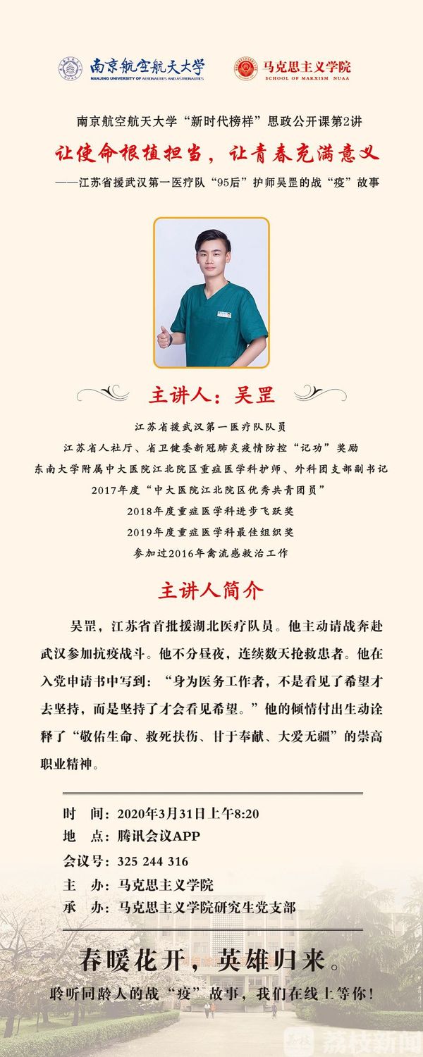 3月31日上午,由万象城娱乐awc线路万象城娱乐awc线路主办的“新时代榜样”思政公开课在线上正式开讲。本次公开课邀请了江苏省支援武汉第一医疗梯队“95”后护师吴罡,通过腾讯会议向师生讲述了抗疫过程中的感人故事。