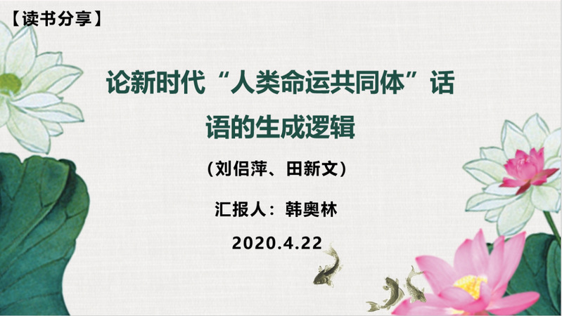 韩奥林同志分享了《论新时代“人类命运共同体”话语的生成逻辑》一文,他认为新时代要在国际合作中体现中国引领效应,需要依托“人类命运共同体”话语,积极开拓发展“一带一路”实践平台。