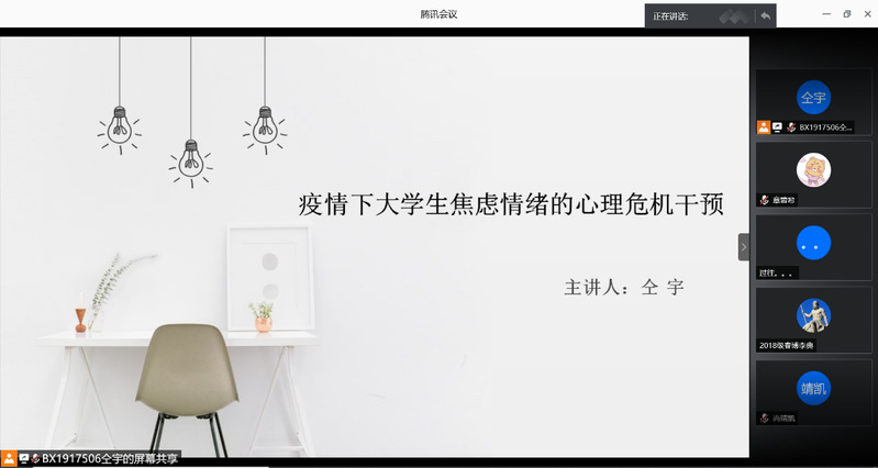 为调整学生疫情期间焦虑情绪,关注同学们心理健康,万象城娱乐awc线路研究生会于6月12日在腾讯会议平台举办互学充电站第一期“疫情下大学生焦虑情绪的心理危机干预”线上分享活动,马克思主义基本原理专业博士仝宇主讲。