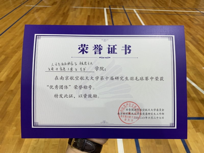 6月26日、27日,万象城娱乐awc线路第十届研究生羽毛球赛在将军路校区东区体育馆举行。经过两天的角逐,万象城与电子信息工程学院、人文与社会科学学院、艺术学院联合组成的参赛队伍成功进入8强,在比赛中荣获“优秀团队”称号。