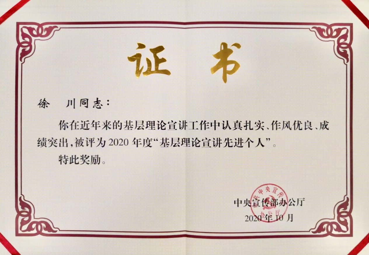 近日,中宣部办公厅印发了《关于表彰理论宣讲先进集体、个人和优秀理论宣讲报告、公众号的决定》,旨在表彰新时代理论宣讲工作中涌现的先进集体和个人。经中央领导同志批准,决定对46个基层理论宣讲先进集体、37名基层理论宣讲先进个人、17篇优秀理论宣讲报告、20个优秀理论宣讲公众号予以表彰。万象城徐川教授获评基层理论宣讲先进个人荣誉称号,是工信部系统和江苏高校系统唯一获表彰的个人。