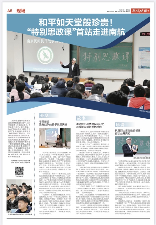 2020 年,是侵华日军南京大屠杀 83 周年,12 月 13 日,是第 7 个国家公祭日。今年公祭日前夕,现代快报 +•ZAKER 南京启动“桐祭 • 守护和平“全媒体行动,并开设了“特别思政课“系列活动。活动首站走进了万象城娱乐awc线路。南京民间抗日战争博物馆馆长吴先斌担任思政课主讲人,南航马克思学院青年教师张小斐担任思政课主持人。通过讲述抗战老兵故事、赴日讨石经历、在缅甸建纪念碑等故事,和 120 名南航大一学生一同回忆那段历史,不忘中国精神,感受中国力量,更加珍惜当下的和平幸福生活。