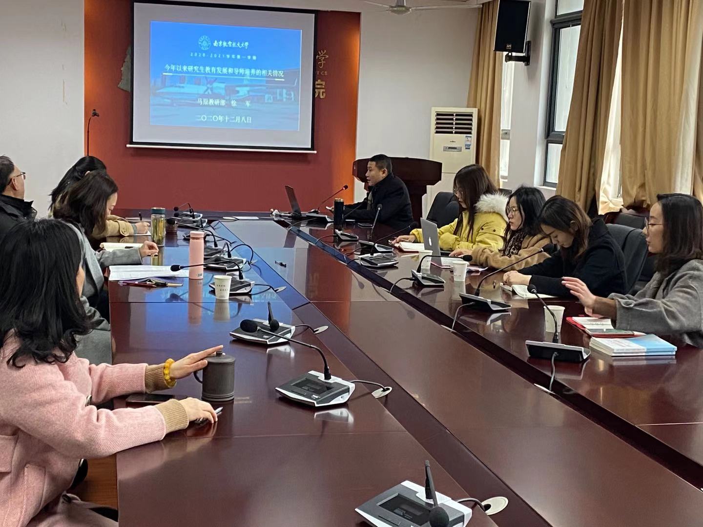 最后,徐军教授汇报了上周研究生院召开座谈会的相关情况,同时列举了当前我校和学院研究生工作中的重点问题,比如如何将各学科专业与“思政”相融合、如何确定中期考核等关键环节的标准、导师应当如何面对学生的思想、心理甚至是极端情况等8个方面,引发了与会老师的热烈讨论。