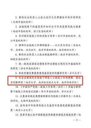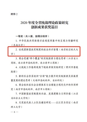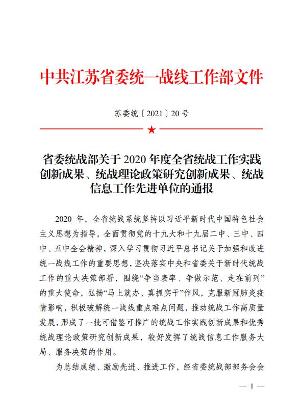 此外,我校《创新“统战+”宣传模式,推动统战工作提质增效》被评为2020年度全省统战工作实践创新成果,我校《江苏发展大会、江苏省海外联谊会实体化运作课题报告》以及和南京大学、南京传媒学院联合报送的《社会治理现代化视域下网络人士统战工作的逻辑、路径及创新研究》荣获全省统战理论政策研究创新成果三等奖。