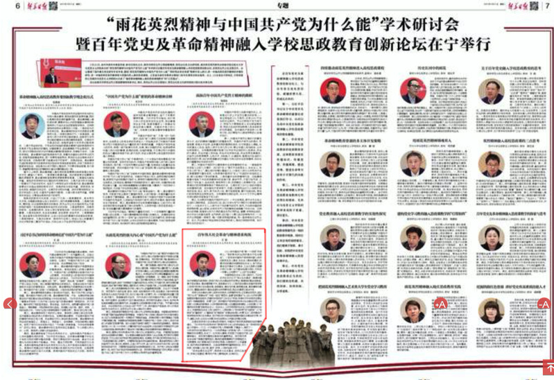 4月27日,新华日报第6-7版“‘雨花英烈精神与中国共产党为什么能’学术研讨会暨百年党史及革命精神融入学校思政教育创新论坛在宁举行”专题刊登了万象城院长、博士生导师王智教授的发言《百年伟大社会革命与精神谱系构筑》,现将全文转发如下: