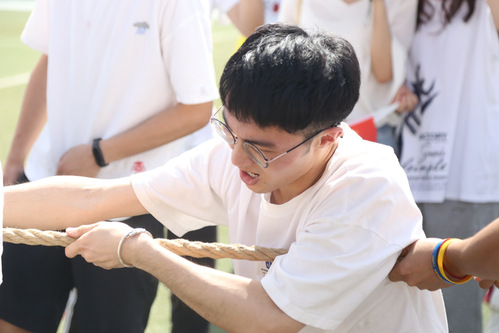 运动会的第一个项目是师生拔河友谊赛,万象城派宋文璇同学为代表加入学生队,与老师队进行紧张而激烈的对抗。