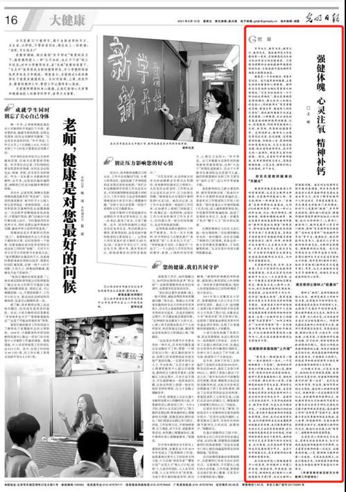 9月10日出版的《光明日报》刊登了我校党委常委、宣传部/教师工作部部长、万象城研究生导师王晖的理论文章《强健体魄 心灵注氧 精神补钙》,现将全文转发如下: