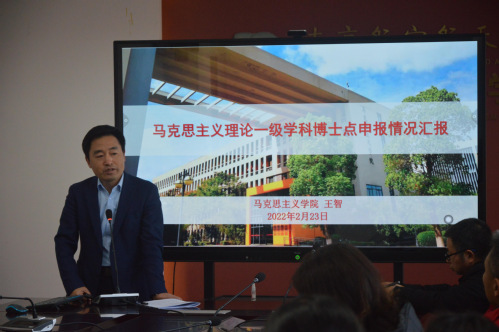院长王智对照《马克思主义理论一级博士学位授权点申请基本条件》,围绕学科方向与特色、学科队伍、人才培养、培养环境与条件等方面,向全体教职工作了《马克思主义理论一级学科博士点申报情况》的报告,并针对当前学院马克思主义理论一级学科博士点申报中存在的问题,提出对策。同时,他还建议全体教职工,特别是青年教师应将自己的研究方向与学科建设相结合,学院将在经费、办公空间、职称指标等方面给予大力支持。