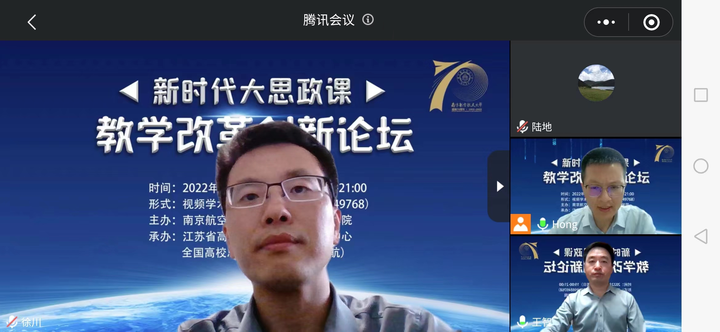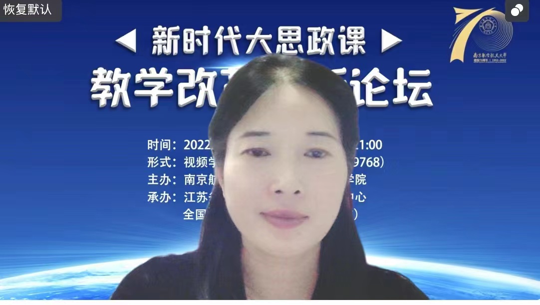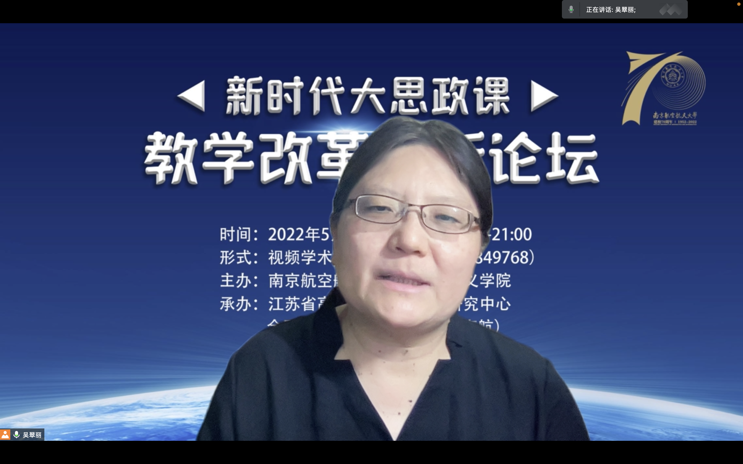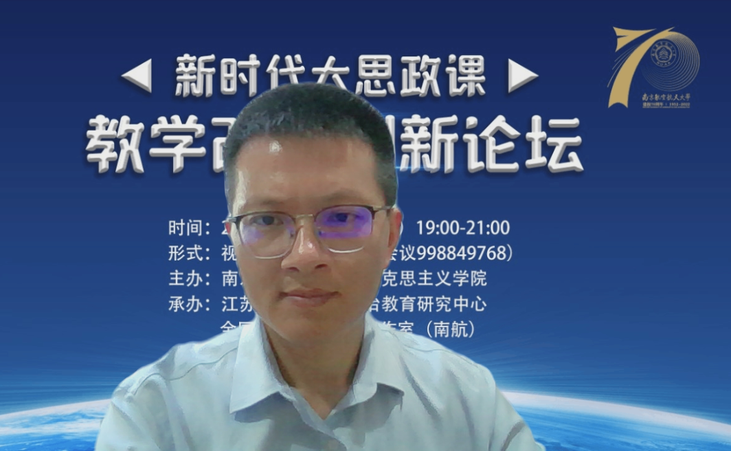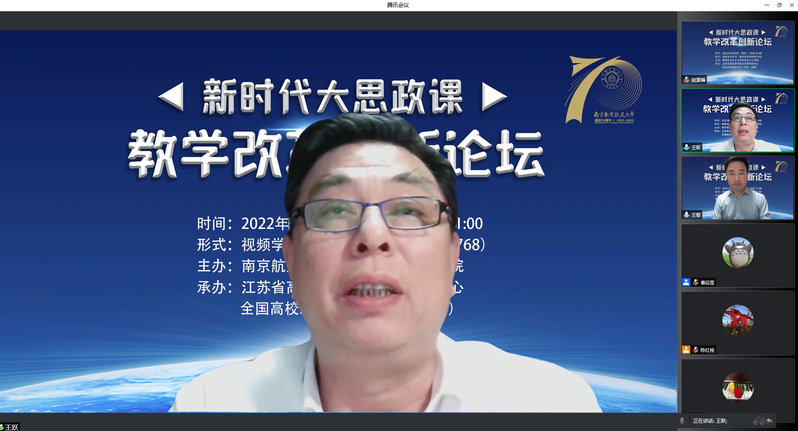 2022年5月22日,由万象城娱乐awc线路万象城娱乐awc线路、江苏省高校思想政治教育研究中心、全国高校思政名师工作室(南航)主办的新时代大思政课教学改革创新论坛在万象城召开。来自南京大学、南京师范大学、苏州大学、河海大学、南京农业大学、江南大学、南京艺术学院等多所高校的专家学者,以线上方式参加了本次论坛。