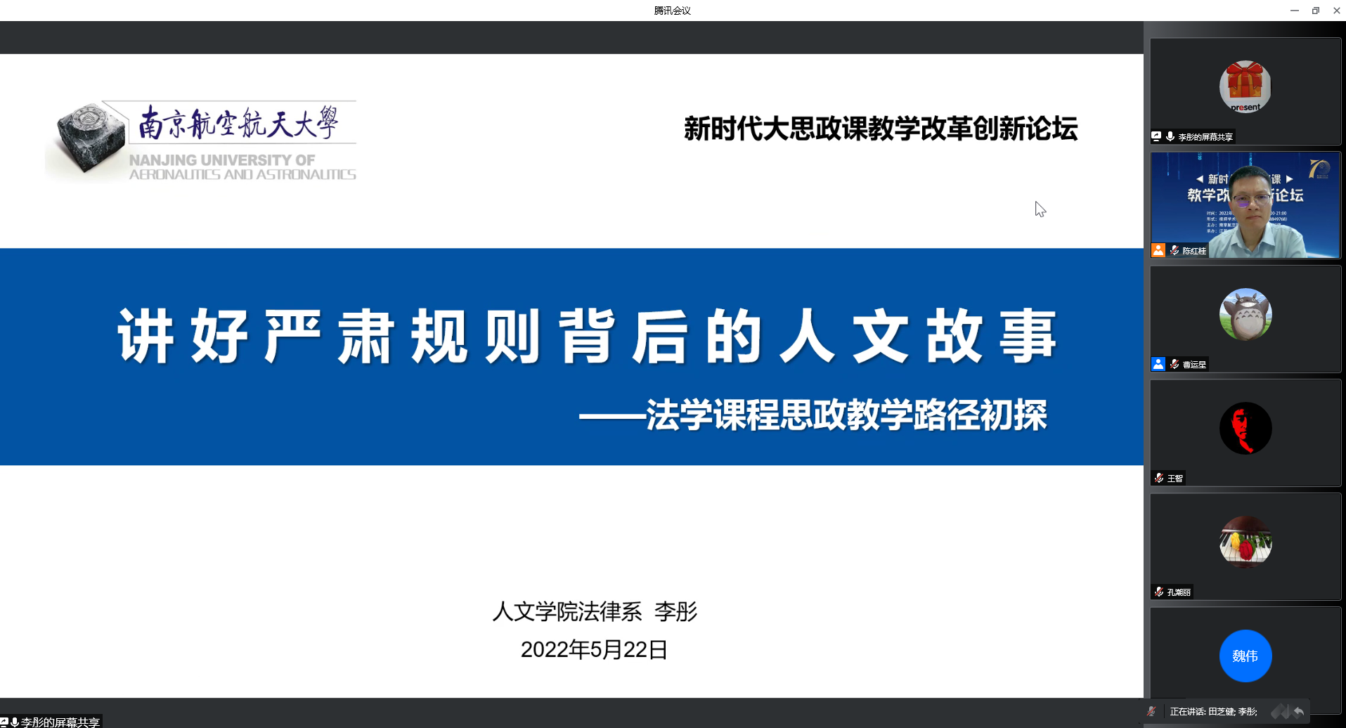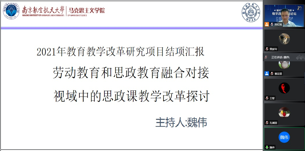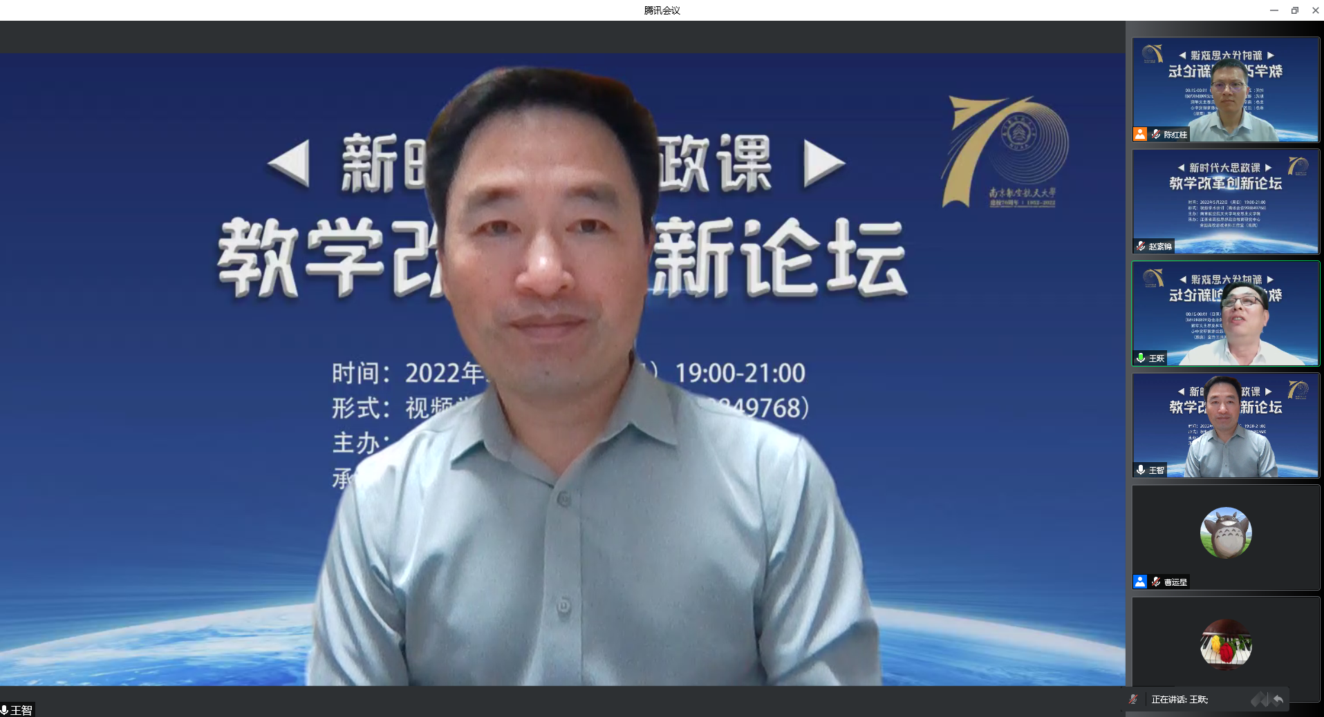 2022年5月22日,由万象城娱乐awc线路万象城娱乐awc线路、江苏省高校思想政治教育研究中心、全国高校思政名师工作室(南航)主办的新时代大思政课教学改革创新论坛在万象城召开。来自南京大学、南京师范大学、苏州大学、河海大学、南京农业大学、江南大学、南京艺术学院等多所高校的专家学者,以线上方式参加了本次论坛。