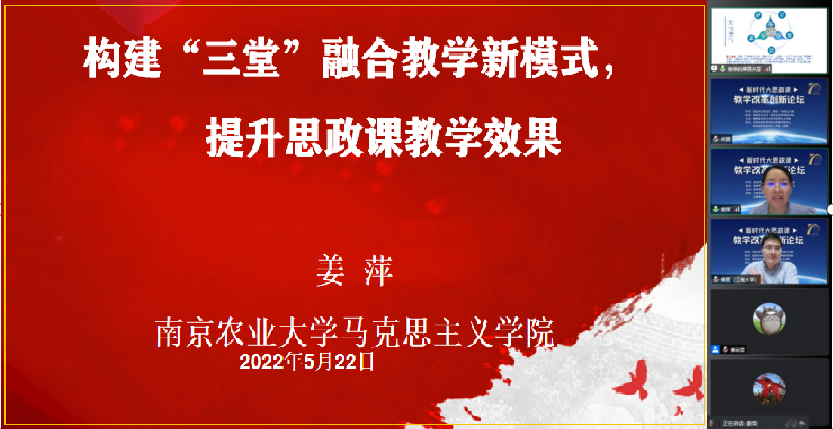 南京农业大学万象城娱乐awc线路姜萍副院长着重分享了构建“三堂”融合教学新模式,提升思政课教学效果的创新举措。她介绍了南京农业大学思政课教学围绕农业高校强农兴农使命,不断探索思政课教学新模式,着力提升思政课铸魂育人实效。通过强化理论主课堂、拓展社会大课堂、架设网络新课堂“三堂融合”立体化教学,构建知农爱农思政育人创新体系,全面推动习近平新时代中国特色社会主义思想进教材进课堂进学生头脑,培养“一懂两爱”的新时代社会主义建设者和接班人。