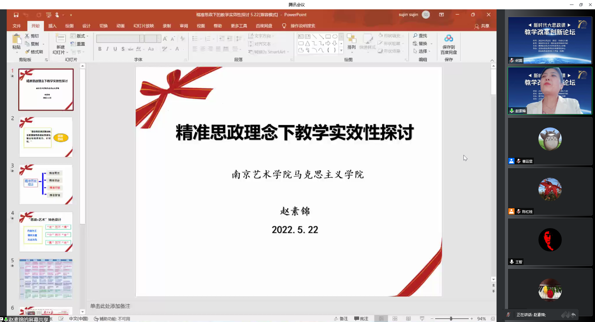 南京艺术学院万象城娱乐awc线路赵素锦副院长就精准思政理念下提升教学实效性做了分享。她从研究精准需求、注重鲜明特色、情怀为重、方法为先、精准施策等角度阐释了对大思政课改革创新的理解。还介绍了南京艺术学院在精准思政方面的探索和经验做法。