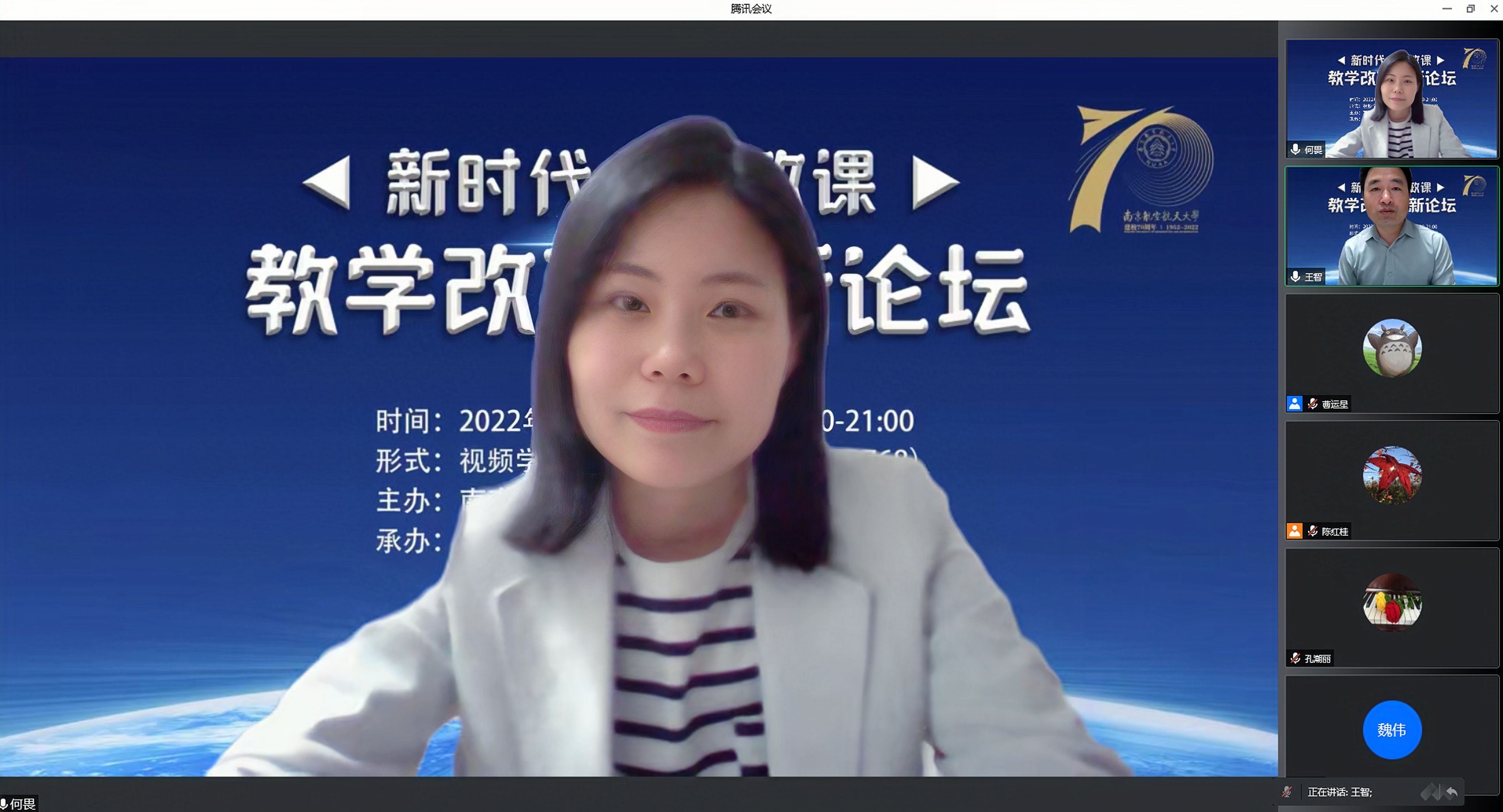 薛葵老师以“智慧教育赋能思政课供给侧结构改革”为题进行教学经验分享。她一方面主张从课前、课中和课后的教学全过程中精化有效供给的内容。另一方面,提出通过智慧平台实现师生互动、生生互动、人机互动、人际互动,把思政课的“一对多”转化为“多对多” “一对一”,激发调动学生的自主学习热情和潜力,从而创新有效供给的方式。通过思政课教学,引导学生掌握历史规律,培养思维方式,构筑开启有意义人生道路的“能力加油站”。