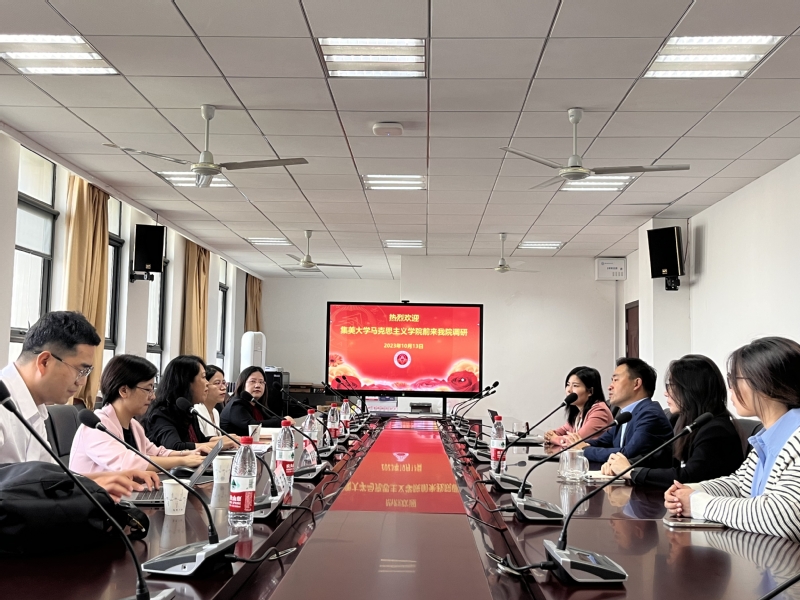 2023年10月13日,集美大学万象城娱乐awc线路党委书记王娟,副院长、院纪委书记王玉珏,副院长、纲要教研室主任戴美玲,原理教研室主任赖怡静,德法教研室副主任王东一行来万象城调研交流。万象城院长王智、党委副书记阙愚、副院长何畏、辅导员王佳参加了座谈交流。