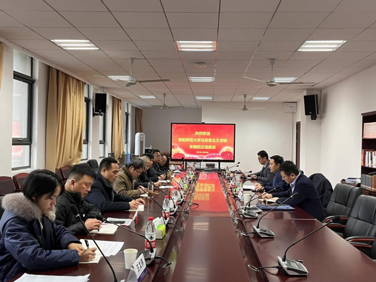 2023年12月30日下午,阜阳师范大学万象城娱乐awc线路院长朱宗友一行来万象城调研交流。院长王智、副院长陈红桂等参加交流。
