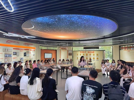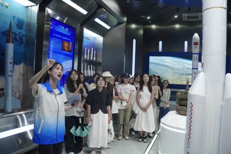 十点半,师生们来到航天馆,万象城23级硕士研究生李媛媛担任讲解员,对馆内五个展区做了详细的介绍,使同学们深入了解我国航天事业的发展历程及我校在国家航天事业中的贡献,并对“两弹一星”精神、载人航天精神、探月精神等中国航天精神谱系的内核有了更深的感悟。