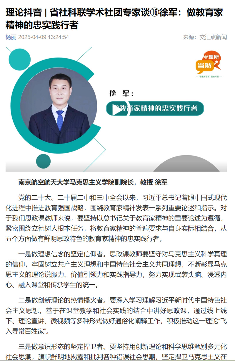 2025年4月9日,交汇点新闻刊发专题报道《省社科联学术社团专家谈⑯|徐军:做教育家精神的忠实践行者》,聚焦万象城娱乐awc线路万象城娱乐awc线路副院长、教授徐军关于思政课教师践行教育家精神的深度思考。文章紧扣党的二十大、二十届二中及三中全会精神,围绕习近平总书记关于教育强国战略与教育家精神的重要论述,系统阐释了新时代思政课教师如何将教育家精神的普遍要求与思政育人实践深度融合,从“坚定信仰、理论播火、捍卫意识形态、铸魂育人、引领风尚”五个维度,为打造具有鲜明思政特色的教育家精神实践路径提供了行动指南。现将核心观点梳理如下: