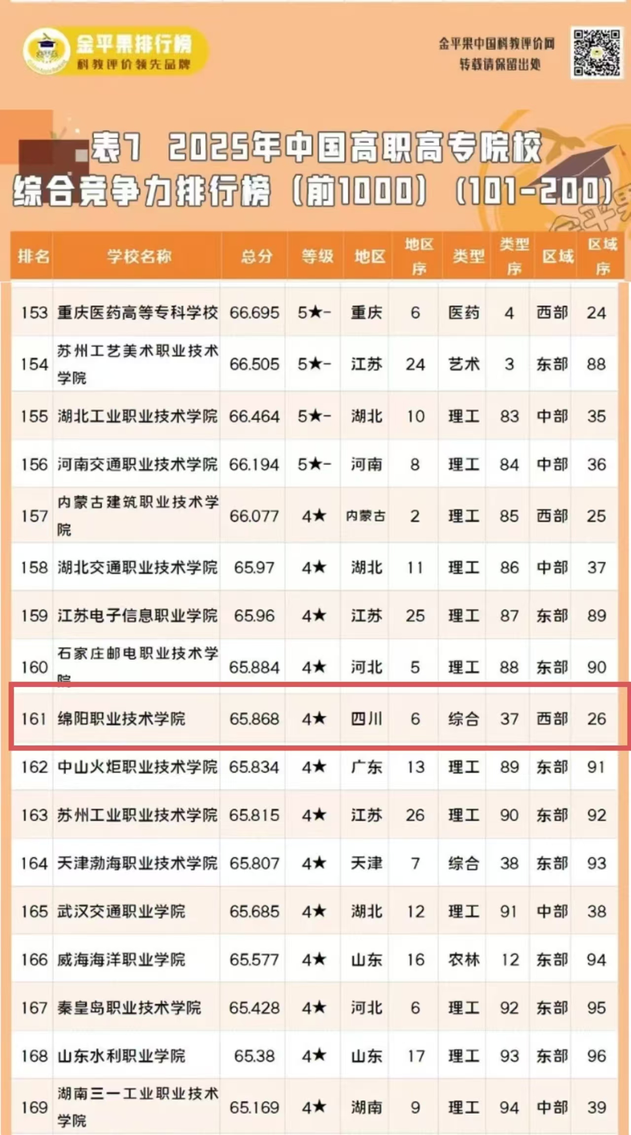 3月17日,金平果中评榜2025版中国高职院校综合竞争力排行榜正式发布。作为连续第十四次发布的权威评价结果,taptap在全国1500余所高职高专院校中跃居161位,较2024年的排名上升19位。该榜单由杭州电子科技大学中国科教评价研究院、武汉大学中国科学评价研究中心等机构联合研发,以全面性、专业性和权威性著称,是衡量高职院校办学实力的重要参考。