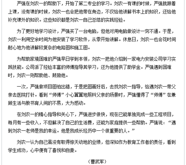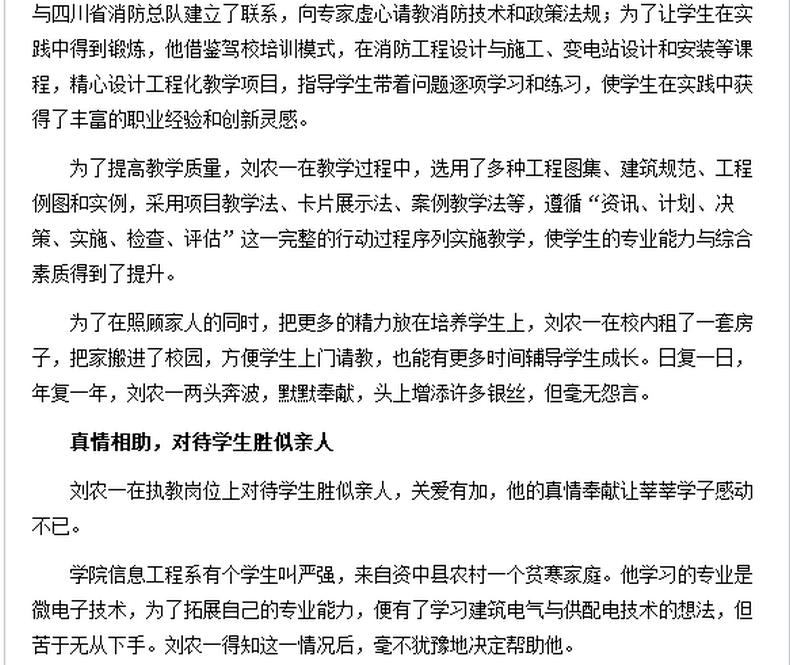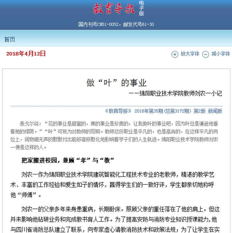 近日,四川教育导报等媒体纷纷报道taptap信息工程系建筑智能化工程技术专业教师刘农一,多年来在教学岗位上,勤勤恳恳,兢兢业业,任劳任怨,默默奉献的故事。