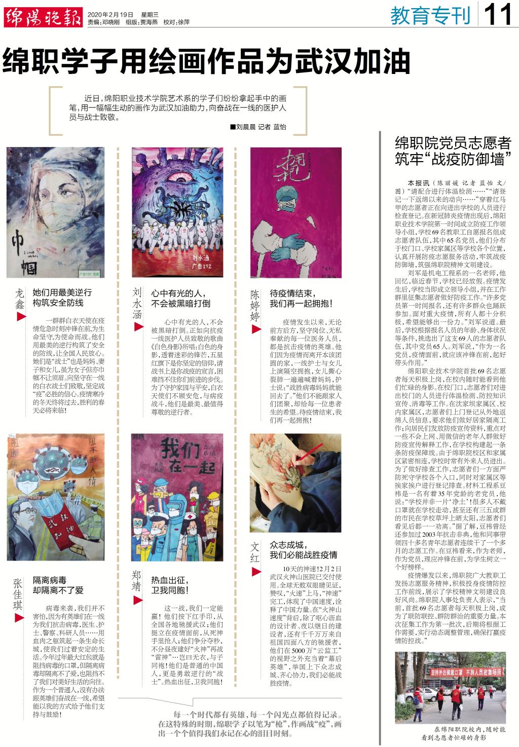 中国高职高专教育网、人民日报、凤凰新闻、四川教育信息网、四川职教网、绵阳晚报:以笔为“枪”作画战“疫” 绵职学子用绘画为武汉加油