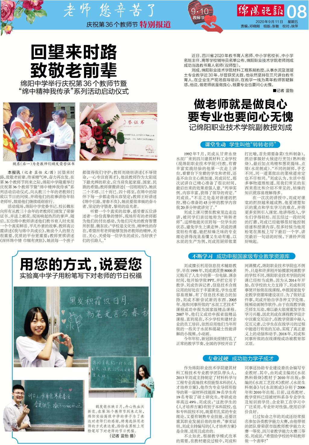 近日。四川省2020年教书育人名师、中小学名校长、中小学名地主任、高等学校辅导员名单公布。学院副教授刘成成功当选教书育人名师(双师型)。绵阳晚报对刘成老师30余年的从教经历进行了报道。