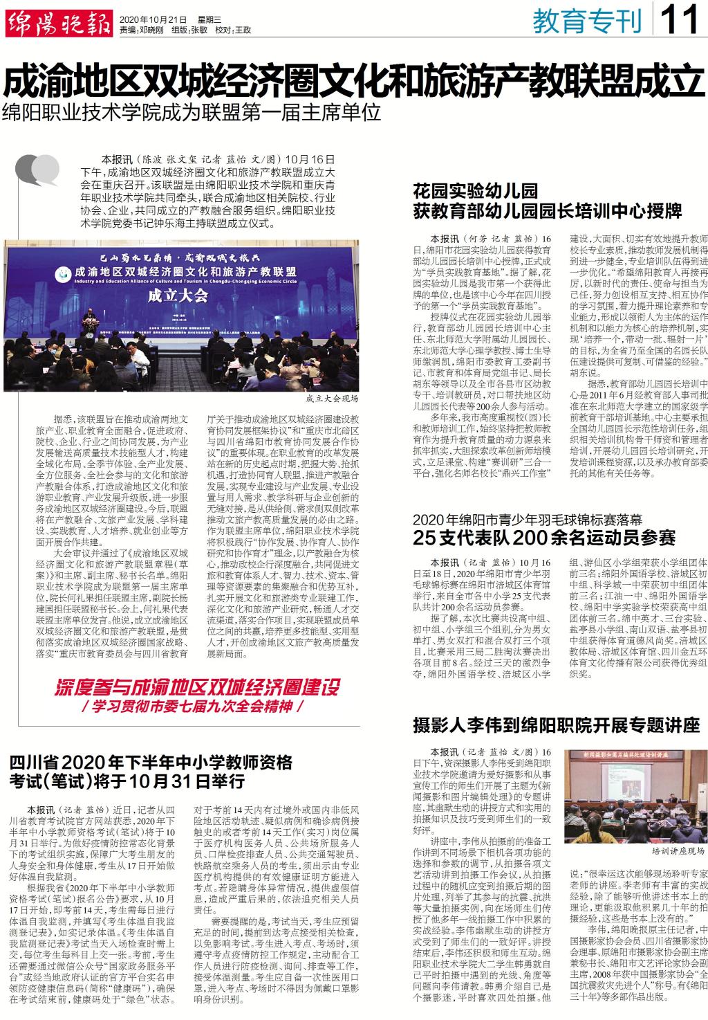 人民日报、今日头条、四川在线、绵阳观察、绵阳新闻网:成渝地区双城经济圈文化和旅游产教联盟成立,绵阳职院成为第一届主席单位