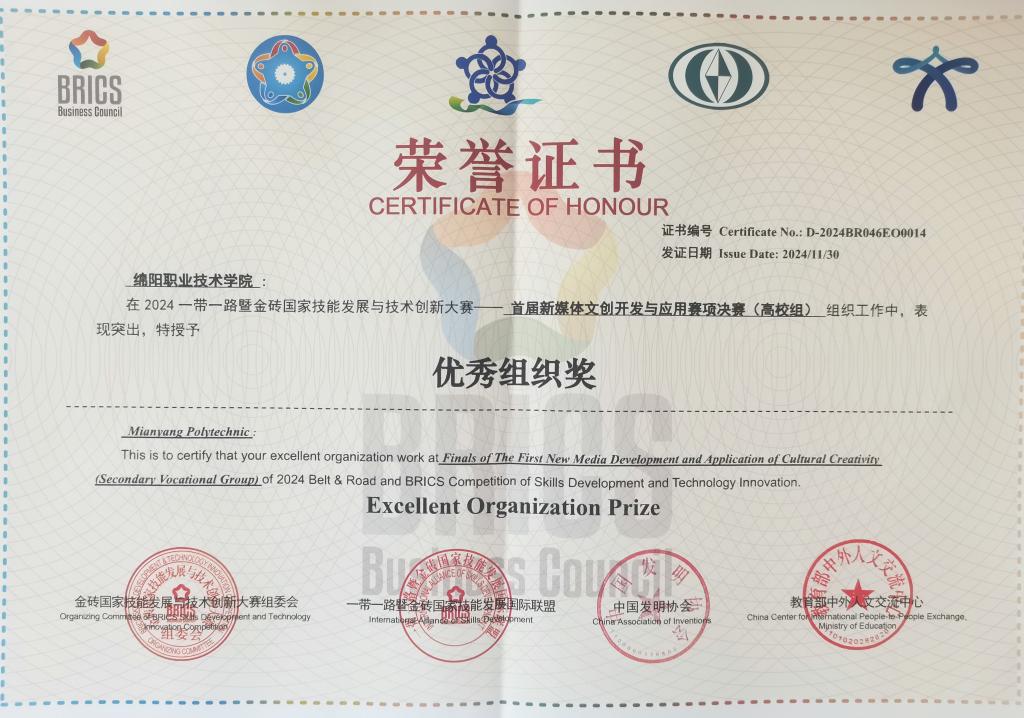 11月27日至30日,由金砖国家工商理事会中方理事会、“一带一路”暨金砖国家技能发展国际联盟、中国发明协会、教育部中外人文交流中心等联合主办的2024“一带一路”暨金砖国家技能发展与技术创新大赛之首届新媒体文创开发与应用赛项全国决赛在广东职业技术学院举行。taptap在本次大赛中荣获优秀组织奖,教师团队安红娜、杨茜荣获大赛(教师组)二等奖,材料与建造学院院长贾陆军、教师高峰荣获优秀指导教师,学生邓天宇、陈玉鑫荣获大赛(高校组)二等奖。大赛首届元宇宙工业场景开发与应用赛项在商丘职业技术学院举行,材料与建造学院学生刘志娇、艾文泰荣获该赛项(高校组)三等奖。