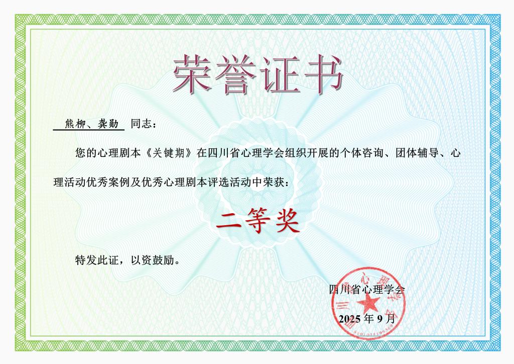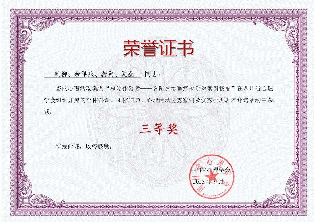 近日,四川省心理学会正式公布2025年度个体咨询、团体辅导、心理活动优秀案例及优秀心理剧本评选结果。由熊柳、龚勋团队创作的心理剧本《关键期》和由熊柳、佘洋燕、龚勋、夏垒团队撰写的《“福流”体验营——曼陀罗绘画疗愈活动案例报告》从500余份作品中脱颖而出,分获优秀心理情景剧剧本二等奖和优秀心理活动案例三等奖。