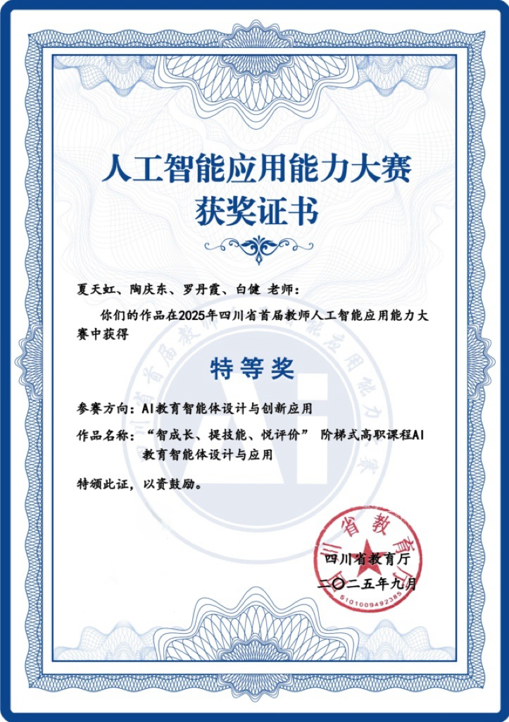值得一提的是,在9月19日四川省教育厅公布的首届教师人工智能应用能力大赛获奖名单中,taptap教师夏天虹、陶庆东、罗丹霞、白健组成的教学团队,凭借《“智成长、提技能、悦评价”阶梯式高职课程AI教育智能体设计与应用》作品荣获职业教育组(方向二)特等奖,并在该赛道排名第一。