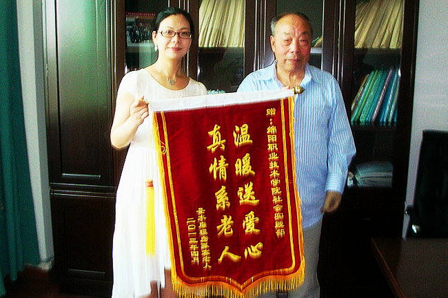 5月21日,圣水廉租房孤寡老人代表来到我院,将一面“温暖送爱心,真情系老人”锦旗赠与我院团委书记、学工部副部长曹艳。